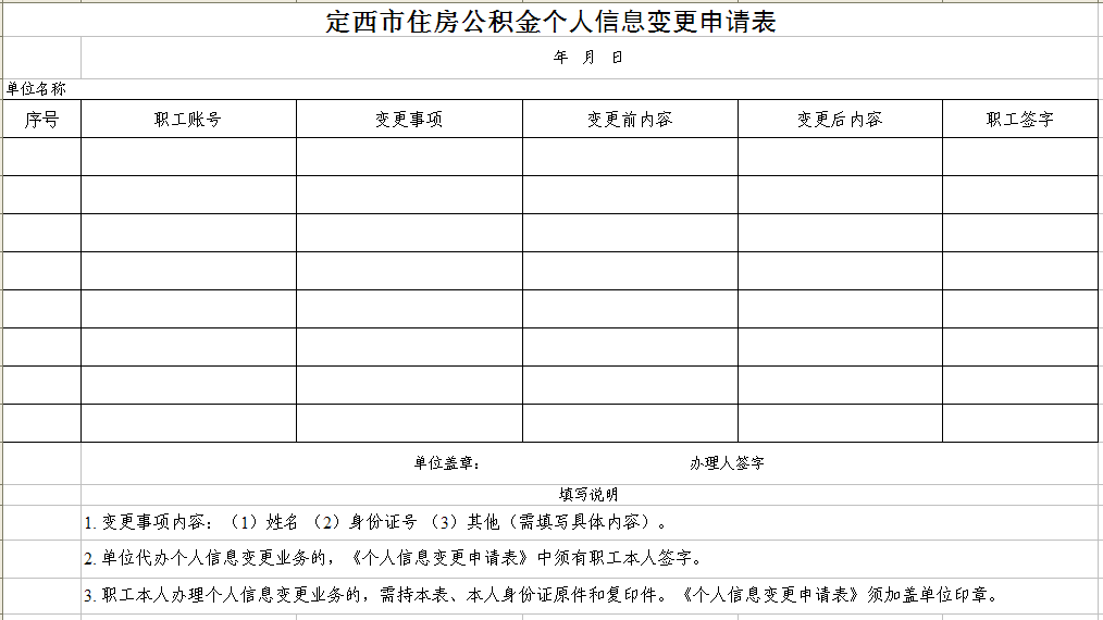 定西市住房公积金个人信息变更申请表