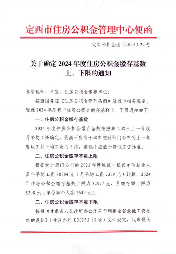 关于确定2024年度住房公积金缴存基数上、下限的通知